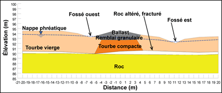 Le remblai repose sur une couche de tourbe dont l'épaisseur varie entre 1,5 et 3,0 m en diminuant en direction sud. Il s'agit d'une tourbe noire fibreuse très compressible dont la teneur en eauNote de bas de page 5 est comprise entre 325 % et 841 % avec des valeurs de l'ordre de 500 % sous la voie ferrée. La masse volumique de la tourbe est d'environ 1000 kg/m3.
