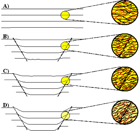 Selon l'étude, l'accumulation des tassements dans la tourbe a lieu uniquement sous la voie ferrée, ce qui engendre une distorsion des fibres, vu que la tourbe à l'extérieur de la zone d'influence ne subit pas de tassement (voir la figure 4). Cette distorsion entraîne un réalignement des fibres de la tourbe jusqu'à former deux plans de cisaillement qui se développent progressivement à mesure que le tassement permanent sous la voie ferrée augmente.