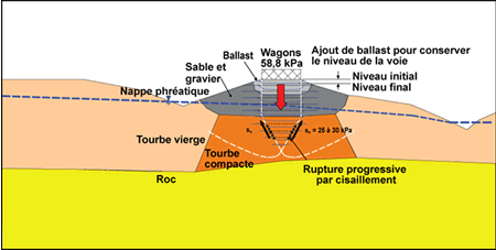 - Les tassements de la plate-forme de la voie se sont accumulés sous l'effet des chargements répétitifs et ont créé progressivement une distorsion et un réalignement des fibres de la tourbe, ce qui a vraisemblablement engendré une rupture soudaine par poinçonnement.
