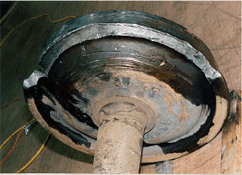 La table de roulement de la roue rompue présentait des écaillages adjacents au boudin de la roue, dont l'un avait un diamètre de 1,7 pouce et l'autre, un diamètre de 2,4 pouces (voir la photo 2). L'écaillage de 2,4 pouces n'était pas continu, mais l'écaillage de 1,7 pouce dépassait les limites admissibles de l'Association of American Railroads (AAR) qui exigent que les roues ayant des écaillages continus de la surface de roulement de 1 pouce de diamètre ou plus soient mises hors service. Il n'y avait aucun indice ou défaut dûs à la chaleur.