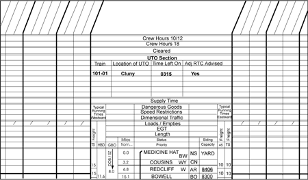 - Consigner l'identification du train, la subdivision et la position de l'occupation non identifiée de la voie sous la colonne d'identification du train, dans la partie centrale du haut de la feuille de planification.