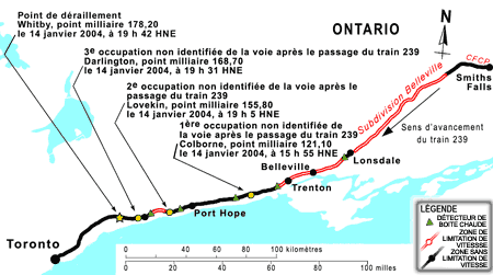 Dans la subdivision Belleville, la voie principale est simple et elle est orientée dans l'axe est ouest entre Smiths Falls, point milliaire 0,0, et Toronto, point milliaire 211,5. La subdivision compte de nombreuses voies d'évitement qui permettent le passage de trains de sens contraire. La vitesse maximale autorisée est de 60 mi/h. Aucune limitation de vitesse n'était en vigueur dans le secteur où le déraillement s'est produit.