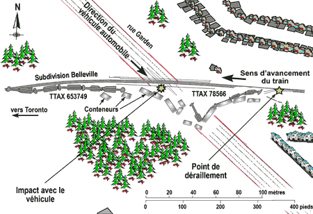 Le 14 janvier 2004, vers 19 h 42, heure normale de l'Est, 11 plates-formes chargées de 18 conteneurs ont déraillé au point milliaire 178,20 de la subdivision Belleville. Les plates-formes faisaient partie du train intermodal numéro 239-13 du Chemin de fer Canadien Pacifique qui roulait vers l'ouest. Le déraillement s'est produit un peu à l'est du passage supérieur de la rue Garden, à Whitby (Ontario). Certaines des plates-formes et certains conteneurs sont tombés sur la chaussée en contrebas et ont heurté une automobile qui roulait en direction sud. Les deux occupantes de l'automobile ont été mortellement blessées.