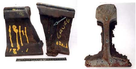 Sur les lieux du déraillement, la voie ferrée a été détruite sur une distance de quelque 200 pieds. Un examen plus poussé fait sur les lieux de l'événement a révélé que le rail sud s'était rompu au point milliaire 178,20, soit à environ 300 pieds à l'est du passage supérieur de la rue Garden. En direction est à partir de cet endroit, on a relevé des marques d'impact du côté intérieur du champignon du rail sud.
