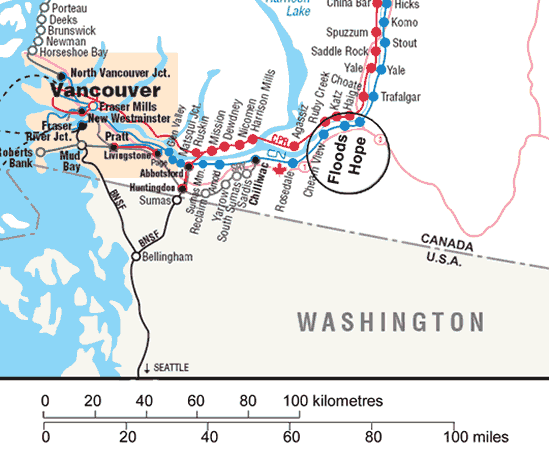 La subdivision Yale du Canadien National (CN) va de Boston Bar au triage Thornton, à Surrey, soit une distance de 113,8 milles. Dans cette subdivision, la circulation ferroviaire est régie grâce au système de commande centralisée de la circulation (CCC) en vertu du Règlement d'exploitation ferroviaire du Canada (REF), et elle est supervisée par un contrôleur de la circulation ferroviaire du CN qui est posté à Edmonton (Alberta). Le CFCP fait rouler un certain nombre de trains dans la subdivision Yale du CN. Dans le secteur où le déraillement s'est produit, la voie principale est simple et est orientée dans l'axe est-ouest, et une voie d'évitement de 6 030 pieds de longueur est adjacente à la voie principale, au sud de cette dernière. Dans le secteur du déraillement, la vitesse maximale autorisée est de 55 mi/h pour les trains de voyageurs et de 50 mi/h pour les trains de marchandises. La subdivision voit passer six trains de voyageurs de VIA Rail par semaine et environ 30 trains de marchandises par jour.