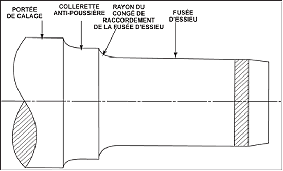 Les roulements à rouleaux sont emmanchés à la presse sur les fusées d'essieu. Les roues sont emmanchées à la presse sur les portées de calage. La fusée et la portée de calage ont des diamètres transversaux différents. Deux changements de rayon consécutifs permettent de faire la transition entre le grand diamètre de la portée de calage et le diamètre plus petit de la fusée d'essieu. La collerette anti-poussière va de la portée de calage au sommet du rayon du congé de raccordement de la fusée d'essieu; le rayon du congé de raccordement de la fusée d'essieu va de la partie inférieure de la collerette anti-poussière jusqu'à la surface de la fusée. Les deux transitions sont censées avoir des contours lisses (voir la figure 2).