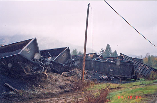 Le 24 octobre 2004, à 1 h 10, heure avancée du Pacifique, un wagon du train de marchandises no 823-957 du Chemin de fer Canadien Pacifique a déraillé au point milliaire 41,30 de la subdivision Yale du Canadien National (CN), tandis que le train roulait vers l'ouest à une vitesse d'environ 37 mi/h, près de Floods (Colombie-Britannique). Le train a poursuivi sa route jusqu'au point milliaire 44,40, où 23 autres wagons ont déraillé. Sur les 24 wagons déraillés, 21 ont été détruits et 3 ont subi des dommages mineurs. Le déraillement a détruit la voie ferrée sur une distance de quelque 1 500 pieds et a causé la destruction d'une guérite de signalisation et de deux petites dépendances construites sur une propriété privée, et il a causé des dommages au passage à niveau du point milliaire 42,28. Il n'y a pas eu de déversement de matières dangereuses, et personne n'a été blessé.