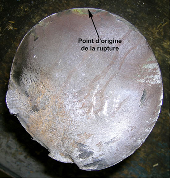 - La zone de rupture fragile avait une apparence fibreuse. La rupture catastrophique s'est produite dans des conditions de service normales, quand la surface transversale réduite de l'essieu n'a plus été en mesure de supporter le poids du wagon.