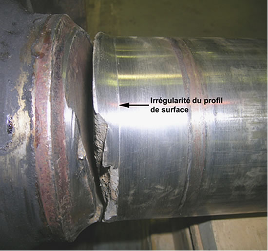 - L'irrégularité du profil de la surface a vraisemblablement été introduite au cours de la remise à neuf de l'essieu, quoique l'essieu ait été conforme à la norme pertinente de l'Association of American Railroads (AAR). L'irrégularité de la surface a été le point d'origine de contraintes de service à la racine, elle a joué le rôle de zone de concentration des contraintes et elle a facilité l'amorce du processus de rupture par fatigue.