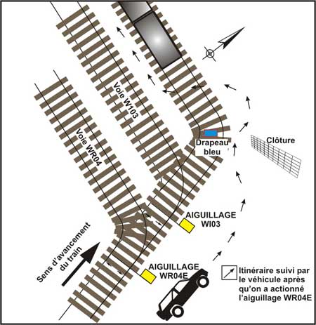 Le mouvement étant arrêté, le véhicule roule en direction est le long de la route d'accès nord, puis tourne vers l'ouest avant de s'arrêter le long de l'aiguillage WR4E. L'opérateur de la loco-commande descend du véhicule et passe devant celui-ci pour se rendre à l'aiguillage WR4E. Il appuie sur le bouton placé sur le côté de l'appareil de manoeuvre de l'aiguillage à commande électrique, afin d'orienter l'aiguillage pour la voie WI03. L'opérateur de la loco-commande observe les aiguilles pendant qu'elles s'orientent vers la voie à suivre et croit voir un voyant vert sur la cible d'aiguillage. L'opérateur de la loco-commande revient au véhicule, attend un peu, puis se fait conduire en direction ouest le long de la voie WI03, précédant le mouvement d'environ 400 pieds (voir la figure 1).