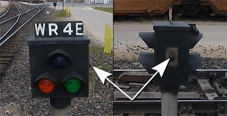 - 11 h 50 - Après que le bogie avant du wagon de tête a dépassé les aiguilles, l'aiguillage WR4E revient en position renversée et s'oriente et se verrouille pour la voie WR04. Le voyant jaune de la cible d'aiguillage s'allume, indiquant que l'aiguillage est en correspondance et est verrouillé pour cet itinéraire.