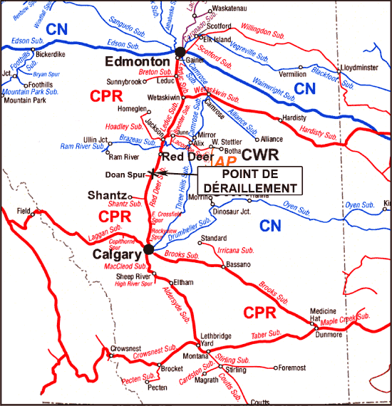 La subdivision Red Deer est un tronçon où la voie principale, qui est simple, va de Calgary, point milliaire 0,0, à Red Deer, point milliaire 95,6. La circulation ferroviaire y est régie grâce au système de régulation de l'occupation de la voie (ROV), en vertu du Règlement d'exploitation ferroviaire du Canada (REF), et elle est supervisée par un CCF posté à Calgary. La vitesse en voie autorisée pour les trains de marchandises était de 45 mi/h; toutefois, les ordres temporaires suivants de vitesse réduite (voir la figure 2) étaient en vigueur au moment du déraillement :