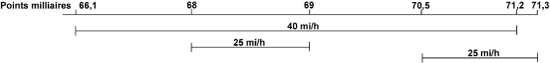 - 25 mi/h entre le point milliaire 70,5 et le point milliaire 71,3 – en raison de l'état des traverses