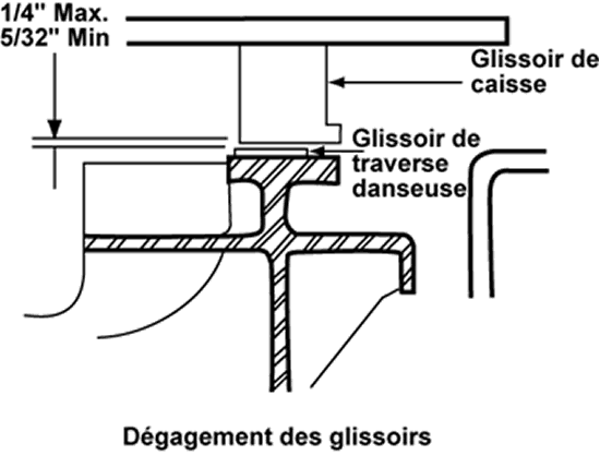 Chaque bogie d'une locomotive comporte un glissoir monté de part et d'autre de la traverse danseuse, qui se trouve vis-à-vis d'un glissoir de caisse monté sur le cadre auxiliaire de la locomotive (voir la figure 5). General Motors (GM) exigeait un dégagement minimum de 5/32 de pouce pour les glissoirs; toutefois, le CFCP permettait, avant que le dégagement diminue jusqu'à 1/32 de pouce, qu'on vérifie l'usure des garnitures des cuvettes de traverse pivot des bogies et qu'on les remplace au besoin. Aucun mesurage du dégagement des glissoirs n'a été consigné dans les rapports d'inspection pour indiquer si le dégagement des glissoirs de la locomotive respectait les spécifications du constructeur et s'il était conforme à la réglementation de Transports Canada (TC).