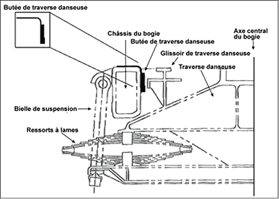 Les locomotives GP 9 construites par GM ont des bogies munis de bielles de suspension. La traverse danseuse oscille latéralement, atténuant le plus possible les impacts entre la traverse danseuse et la caisse du wagon, de façon à amortir les forces latérales qui sont transmises à la structure de la voie. Au fond de la cuvette de traverse pivot, les garnitures facilitent les mouvements de la traverse danseuse et de la caisse du wagon en maintenant le dégagement des glissoirs. Une mauvaise lubrification des cuvettes de traverse pivot des bogies peut entraîner une usure des garnitures, ce qui peut faire en sorte que le dégagement des glissoirs soit inexistant. Les bogies ont alors de la difficulté à pivoter et peuvent contribuer à accroître les forces latérales qui s'exercent contre le rail à l'interface roues/rail.
