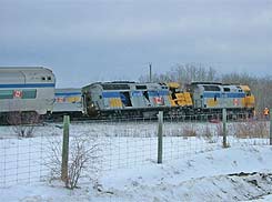 Le 31 janvier 2005 à 13 h 10, heure normale des Rocheuses, le train de voyageurs no 1 de VIA Rail Canada Inc., alors qu'il roulait vers l'ouest, a été heurté par un camion grumier qui roulait vers le sud sur la route secondaire 751, au passage à niveau public situé au point milliaire 92,26 de la subdivision Edson du Canadien National. Le passage à niveau était protégé par des feux clignotants, des signaux et des cloches, et par des signaux d'avertissement avancés qui étaient placés à environ 104 m du passage à niveau. La collision a causé le déraillement des deux locomotives et des neuf voitures du train. Le conducteur du camion a subi des blessures graves et a été transporté à l'hôpital. Les 86 voyageurs et les 16 membres de l'équipe du train ont été évacués vers le centre communautaire local. Un voyageur et un membre de l'équipe des services de bord ont été légèrement blessés. Quelque 6500 litres de carburant se sont déversés de la locomotive de tête.