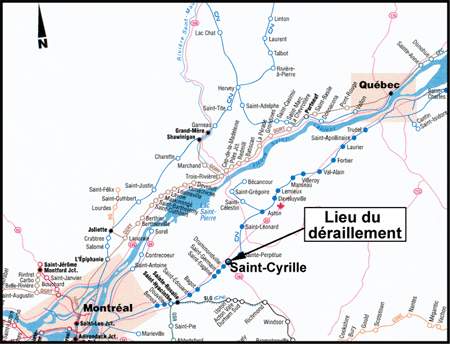 Le parcours en direction ouest vers Montréal (Québec) se déroule normalement jusqu'au point milliaire 87,30 près de Saint-Cyrille (Québec) (voir la figure 1) où un freinage intempestif se déclenche alors que le train circule à une vitesse de 48 mi/h. Une déflagration a lieu et une boule de feu survient vers l'arrière du train. L'avant du train s'immobilise à environ 2000 pieds à l'ouest du passage à niveau du 10e Rang (point milliaire 87,38). Après avoir pris les mesures d'urgence, l'équipe du train suit les instructions fournies par le contrôleur de la circulation ferroviaire (CCF), dételle les locomotives et s'éloigne des lieux de l'accident. La neige recouvre le sol, il y a un léger couvert nuageux et la température est de -20,6 °C.
