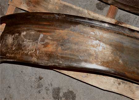 La roue était ovalisée et sa table de roulement présentait un méplat et avait subi, sur une longueur de 22 pouces (voir la photo 3), un écrasement de 0,38 pouce et une déformation plastique qui atteignait jusqu'à un pouce environ (la largeur de la table passant d'une valeur nominale de 5,72 pouces à 6,75 pouces).