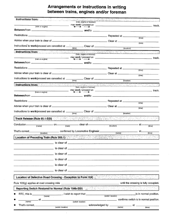 Même s'ils utilisent ce document recto-verso, les membres des équipes utilisent pendant leurs parcours plusieurs autres documents de travail sur lesquels ils écrivent des renseignements au recto seulement (par exemple, les bulletins d'exploitation quotidiens [BEQ], les bulletins de marche relatifs à un train spécifique [BMTS], les feuilles de train et les rapports relatifs au contrôle des mouvements des trains).