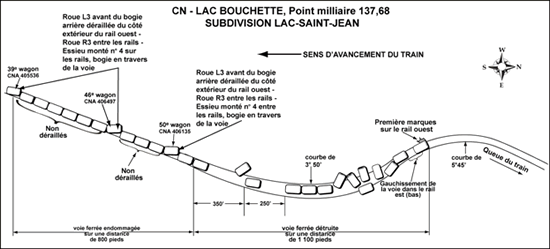 Près de Lac Bouchette (voir la figure 1), alors que le train roule à 30 mi/h et que la manette des gaz est à la position 8, un freinage d'urgence provenant de la conduite générale se déclenche. La locomotive de tête s'immobilise au point milliaire 136,95. Après avoir pris les mesures d'urgence, l'équipe du train constate que 16 wagons chargés et 2 wagons vides ont déraillé. Ce sont les wagons qui occupent les places 39, 46 et de 50 à 65 à partir de la tête du train.