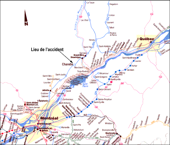 Le 4 juin 2006, à 12 h 37, heure avancée de l'Est, 14 wagons (dont 10 chargés et 4 vides), y compris 7 wagons chargés de marchandises dangereuses, du train de marchandises M-36831-03 du Canadien National ont déraillé alors que le train franchissait un pont au point milliaire 65.1 de la subdivision Joliette, près du village de Charette (Québec). Les wagons chargés de marchandises dangereuses comprenaient 2 wagons chargés d'essence, 3 wagons chargés de mazout et 2 wagons chargés d'acide sulfurique. Environ 233 000 litres d'hydrocarbures se sont échappés des 3 wagons-citernes et une partie s'est déversée dans la rivière du Loup tout près. L'accident n'a pas fait de victimes.