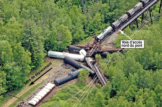 Le premier wagon déraillé, un wagon-tombereau, s'est immobilisé au point milliaire 64,78, et son bogie arrière a été déporté du côté ouest. Les 50e et 51e wagons, également des wagons-tombereaux, se sont immobilisés dans le fossé du côté ouest de la voie ferrée, à 915 pieds au sud du premier wagon déraillé. Les neuf autres wagons, à savoir 5 wagons-citernes chargés de marchandises dangereuses comprenant de l'essence ou du mazout se sont entassés au nord du pont (voir la photo 1). L'un des wagons déraillés a touché les lignes d'alimentation électrique, ce qui a entraîné une panne de courant locale. Trois wagons-citernes (un chargé d'essence et deux chargés de mazout) ont été perforés et ont laissé échapper leurs produits, dont une partie s'est déversée dans le remblai et, par la suite, dans la rivière du Loup. Les deux derniers wagons déraillés (PROX 13521 et PROX 13516), chargés d'acide sulfurique, sont restés debout du côté nord du pont. Le boggie avant du wagon PROX 13516 (le dernier wagon déraillé), est tombé entre les rails, et le boggie arrière, du côté intérieur du rail est.