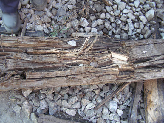 - Les traverses de pont 1, 3, 5, 6 et 9 montraient les signes de fentes profondes qui existaient déjà, alors que la traverse 4 montrait un signe de cisaillement horizontal déjà présent ainsi que des fissures verticales sur toute la surface de la traverse. Ces traverses avaient donc une capacité de retenue latérale réduite en raison des fentes dans le bois qui faisaient intersection avec les trous des crampons de traverse.