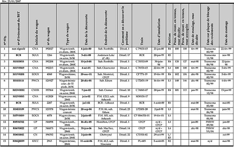 De 2000 jusqu'à maintenant, le CN a documenté au total 15 déraillements en voie principale qui se sont produits au Canada et qui ont été causés par des roues lâches (voir la figure 3). L'annexe A dresse une liste détaillée de ces déraillements. La compagnie a aussi documenté au moins deux autres déraillements dus à des roues lâches qui se sont produits à l'extérieur du Canada. Le CN a signalé 48 autres essieux montés affectés par des roues lâches qui ont été détectés lors d'une inspection subséquente (voir l'annexe B). Dans chacun de ces cas, les roues ont été montées par l'atelier de roues Transcona du CN entre avril 1998 et février 2001, et sont devenues lâches par la suite.