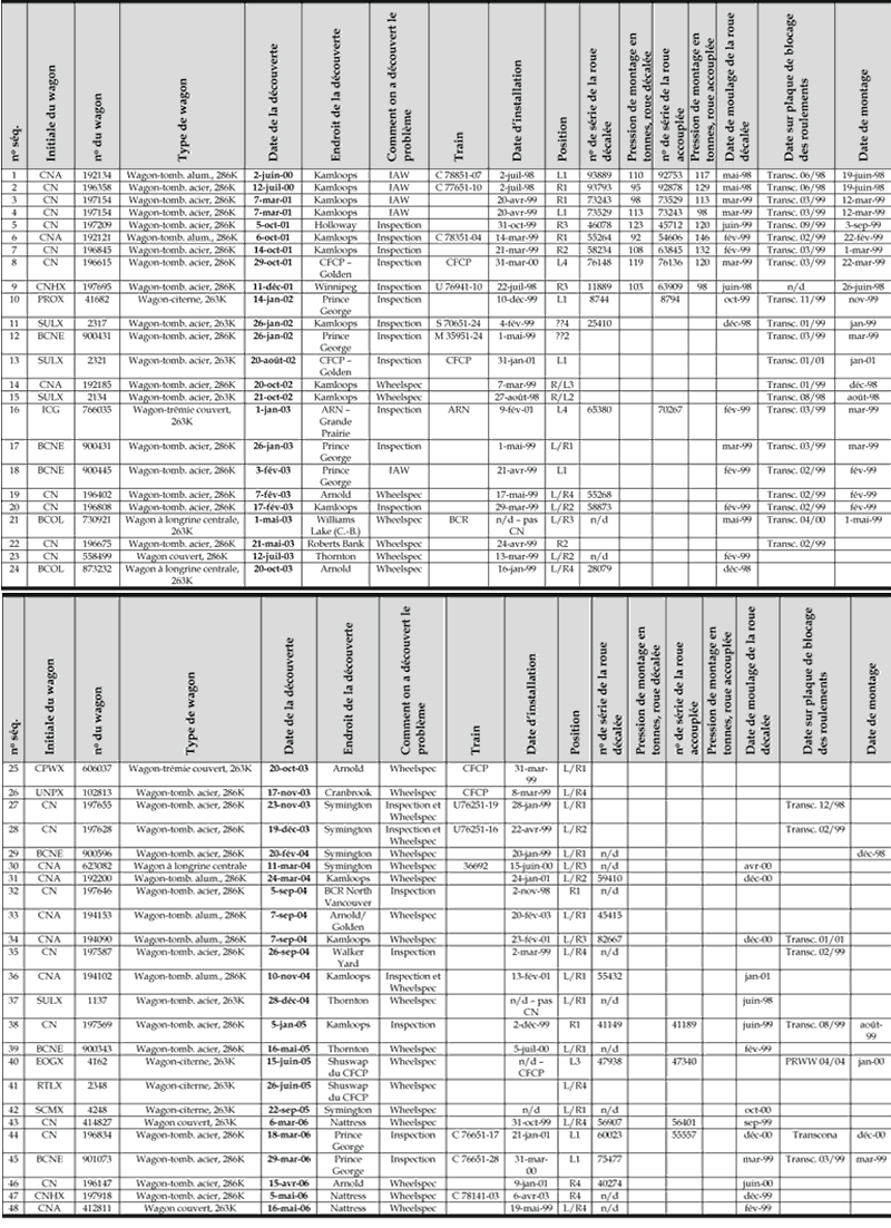 - Le CN a fait faire un grand nombre d'inspections accélérées des roues de son propre parc de wagons-tombereaux servant au transport de charbon et de certains autres parcs similaires de wagons qui roulent sur les voies du CN (par exemple, SULX, PWCX, BCNE, CNHX et CEFX). Les inspections visaient le retrait des essieux montés provenant de l'atelier de roues Transcona qui avaient été assemblés pendant la période de fabrication complète.