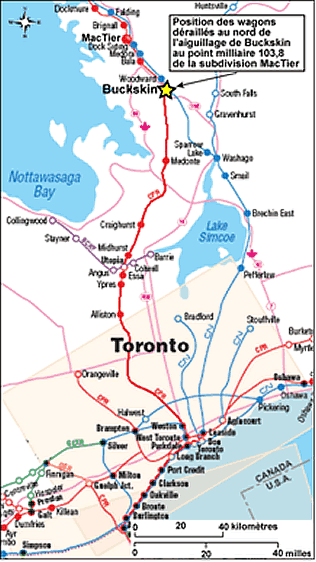 À 8 h 4, tandis que le train roule à 45 mi/h avec la manette des gaz à la position no 3, un freinage d'urgence provenant de la conduite générale se déclenche au point milliaire 103,48. La locomotive de tête s'immobilise au point milliaire 102,89, près de Buckskin (Ontario) (voir la figure 1). L'équipe du train suit les consignes d'urgence, inspecte le train et constate que 12 wagons, du 19e wagon au 30e wagon à partir de la tête du train, viennent de dérailler.