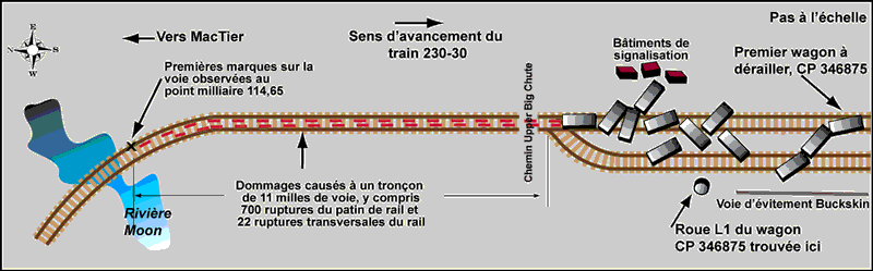 Dans le secteur immédiat du déraillement, un tronçon d'environ 400 pieds de voie, y compris le branchement nord de la voie d'évitement de Buckskin et les structures de signalisation, a été détruit, et un bâtiment de signalisation a été endommagé. À l'extrémité nord des lieux du déraillement, on a observé des dommages considérables du côté intérieur des rails, sur les anticheminants, les selles de rail et les traverses. À partir de cet endroit, on a relevé en direction nord des dommages analogues à des impacts de roues sur la voie principale sur une distance d'environ 11 milles, jusqu'à une série de courts ponts à chevalets qui enjambent la rivière Moon. Les premières marques ont été relevées au point milliaire 114,65, sur le patin du rail est (rail de la file haute) d'une courbe de trois degrés vers la droite (dans le sens d'avancement du train). Dans le tronçon endommagé de 11 milles, on a relevé quelque 700 ruptures du patin du rail et 22 ruptures transversales du rail. Un tronçon de huit milles de longs rails soudés (LRS) a dû être remplacé (voir la figure 2).