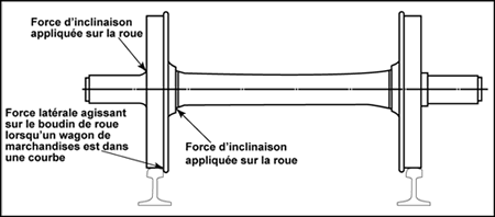 - Quand un wagon de marchandises roule normalement dans une courbe, les efforts latéraux qui s'exercent contre le boudin de la roue font en sorte que la roue s'incline légèrement, ce qui fait que les pointes des spirales de l'alésage, faites d'un métal plus dur, sont poussées contre le matériau plus mou de la portée de calage (voir la figure 4).