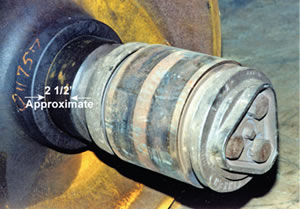 - Le processus continue jusqu'à ce qu'il ne reste plus qu'une petite bande de spirales près du centre de la roue pour maintenir l'ajustement serré. Dans ces conditions, ces roues de 36 pouces peuvent se déplacer (se visser) vers l'intérieur et parfois vers l'extérieur de la portée de calage pendant le service, de sorte que la roue devient lâche et décalée (voir la photo 3).