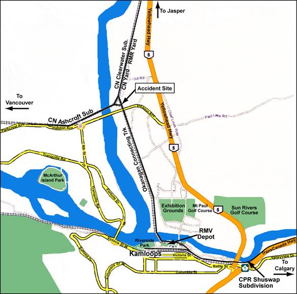 Le train no RMV P61051-21 roulait vers l'est et il était parti de Vancouver (Colombie-Britannique) le 21 mai 2006. Lors de son arrivée à Kamloops (Colombie-Britannique), le train s'est dirigé vers le sud en suivant la voie de raccordement Okanagan (voie OCT) jusqu'au centre-ville de Kamloops, où les passagers sont descendus du train et sont montés dans des autocars qui devaient les transporter vers les hôtels. Le train mesurait approximativement 2 200 pieds de longueur, pesait 1 812 tonnes et se composait de 2 locomotives et de 25 voitures à voyageurs inoccupées.