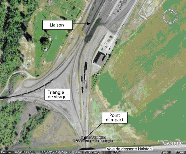 Lors de l'incident, la vue à partir du triage était partiellement bloquée par des arbres voisins de la travée ouest d'accès au passage supérieur routier. Les membres de l'équipe de la RMV ont dit que, tandis que le train s'engageait en marche arrière dans l'aiguillage du triangle de virage donnant accès au triage, ils pouvaient voir la manœuvre d'aiguillage du CN qui franchissait la liaison (photo 2).
