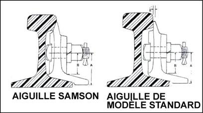Dans une aiguille Samson, l'angle du coin inférieur du champignon du côté intérieur de la contre-aiguille est usiné de façon que l'aiguille s'appuie sur la contre-aiguille. On dit alors que la contre-aiguille est « usinée ». La contre-aiguille usinée sert à protéger l'aiguille des impacts directs contre les boudins des roues des wagons en mouvement, et l'angle permet de résister au désaffleurement des abouts de rails entre les aiguilles et les contre-aiguilles lors du passage des trains. Les contre-aiguilles munies d'aiguilles Samson sont usinées des deux bouts lors de leur fabrication, de façon qu'on puisse les installer de n'importe quel côté de la voie. La figure 2 compare les sections transversales des aiguilles Samson et des aiguilles standard.