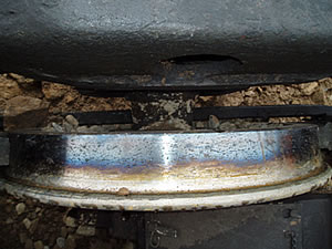 Un examen de la locomotive a montré que les jantes des roues étaient bleuiesNote de bas de page 9 (voir photo 2) et que certaines jantes montraient des signes de patinage. Les sabots de frein ont été endommagés par la chaleur.