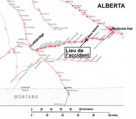 La voie ferrée, dans la zone du déraillement, était une voie principale unique dans une courbe horizontale, généralement orientée dans une direction est-ouest. La voie d'évitement de Bow Island est située au sud de la voie principale et elle va du point milliare 40,90 au point milliare 42,55. Elle a une capacité de 7 925 pi. La voie entre les aiguillages de voie d'évitement est légèrement descendante vers l'ouest.