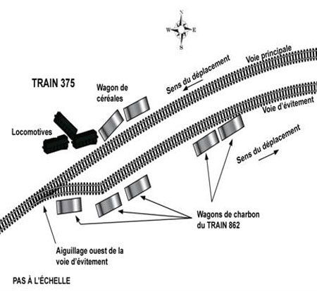 Les cinq wagons de charbon déraillés du train 862 se sont arrêtés au sud de la voie d'évitement située à l'est de l'aiguillage ouest de la voie d'évitement, et parallèlement à celle-ci; le premier et le cinquième wagon sont demeurés debout, alors que les trois autres wagons se sont renversés sur le côté et ont déversé leur cargaison (voir figure 2).
