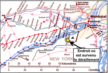 Le 29 mars 2007, à 12 h 26, heure avancée de l'Est, huit wagons du train de marchandises M-32721-28 du Canadien National ont déraillé au point milliaire 202,51 de la subdivision Montréal de la CSX pendant que le train roulait vers le sud en direction de Huntingdon (Québec). Quatre des wagons déraillés étaient des wagons-citernes à basse pression chargés d'acide sulfurique (UN 1830). L'accident n'a causé aucun déversement et n'a fait aucune victime. La voie ferrée a été endommagée sur une distance d'environ 1200 pieds.