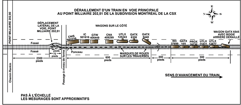Près du milieu du gauchissement de la voie, on a relevé sur le champignon du rail est une marque diagonale de boudin de roue qui allait vers le sud à partir du côté intérieur du rail. À deux pieds de cette marque, en direction sud, on a remarqué que les crampons, les selles de rail et les traverses montraient des marques d'impact du côté extérieur. Des marques correspondantes ont été relevées sur les traverses, du côté intérieur du rail ouest. Les dommages causés à la voie s'étendaient sur une distance de 1200 pieds environ, et allaient jusqu'au bogie arrière du premier wagon déraillé, le wagon GATX 6545 (le 68e wagon à partir de la tête du train). Les 69e à 73e wagons n'ont pas déraillé; les 74e à 80e wagons, y compris les trois wagons-citernes chargés d'acide sulfurique, ont déraillé et se sont immobilisés sur le côté, au pied de la banquette est de la voie (voir la figure 2).