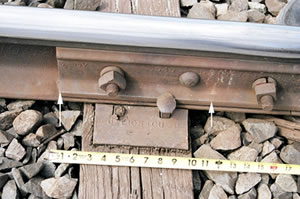 Les rails sont auscultés une fois chaque mois par une voiture de détection des défauts de rails. Le contrôle le plus récent a eu lieu le 8 mars 2007 et n'a révélé la présence d'aucun défaut. Le secteur avait été relativement exempt de problèmes jusqu'en 2005, année pendant laquelle on a commencé à signaler des ruptures d'éclissageNote de bas de page 3 et des gauchissements de la voie. L'examen des rapports sur les dérangements de la voieNote de bas de page 4 ( Track Disturbance Reports ) pour les deux années précédentes a révélé que :