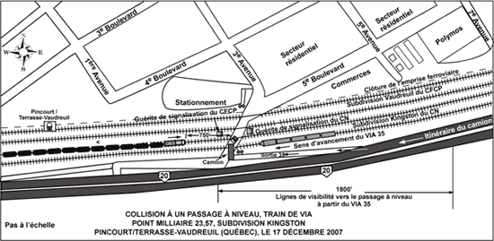 Le 17 décembre 2007 vers 15 h 49, heure normale de l'Est, le train de voyageurs no 35 de VIA Rail Canada Inc., qui roulait en direction ouest à une vitesse de 62 mi/h sur la voie principale sud de la subdivision Kingston du Canadien National, a heurté un tracteur à semi-remorque vide qui était immobilisé sur le passage à niveau public de la 3e Avenue, au point milliaire 23,57, près de Pincourt/Terrasse-Vaudreuil (Québec). Le tracteur à semi-remorque a été détruit; la locomotive a subi des dommages et n'a pas pu poursuivre sa route. À la suite de la collision, 76 voyageurs ont été transférés à bord d'un autre train de VIA Rail Canada Inc. et la circulation ferroviaire a été retardée pendant près de 3 heures ½. Le conducteur du tracteur à semi-remorque a subi des blessures mineures. Le train n'a pas déraillé et la voie n'a pas été endommagée.