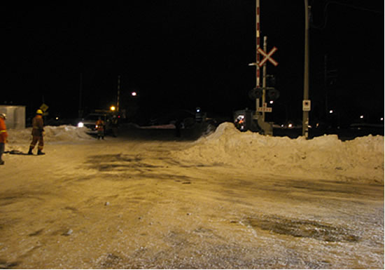 Durant les opérations de déneigement, la plus grande partie de la neige avait été poussée vers le côté de la chaussée et avait formé des bancs de neige atteignant quatre pieds de hauteur. La largeur de la chaussée de la 3e Avenue était rétrécie en raison de la présence de ces bancs de neige. La surface du passage à niveau était enneigée et glacée. On a relevé des marques de pneus sur le côté d'un banc de neige situé à l'angle sud-est de la sortie 35 et de la 3e Avenue, près du mât de signalisation et de la barrière du passage à niveau du CN (voir la photo 1).