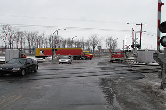 Chaque jour, environ 43 trains de marchandises, 24 trains de voyageurs et 22 trains de banlieue circulent sur le passage à niveau. Quelque 4700 véhicules passent quotidiennement à cet endroit, dont environ 70 camions lourds ou tracteurs à semi-remorque. Le nombre de camions lourds et d'automobiles est appelé à augmenter dans l'avenir, en raison de l'expansion industrielle et résidentielle prévue. Le produit vectoriel totalNote de bas de page 2 du passage à niveau est d'environ 420 000 (55 % pour la subdivision Kingston et 45 % pour la subdivision Vaudreuil).
