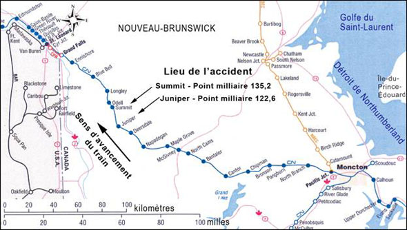 À Juniper, point milliaire 122,6, l'équipe du train fait un arrêt et laisse 78 wagons sur la voie principale pendant qu'on procède au ramassage de 23 wagons additionnels (pesant environ 1 675 tonnes et mesurant approximativement 1 375 pieds). Après avoir attelé l'ensemble des wagons et noté que l'unité de détection et de freinage (UDF) affiche l'augmentation voulue de la pression dans la conduite générale, et que le train satisfait aux autres exigences d'un essai de freins no 2 (conformément au Règlement sur les freins des trains de marchandises et de passagers, approuvé par Transports Canada, voir l'annexe A), l'équipe du train repart en direction ouest. Le voyage se déroule sans incident jusqu'à 1320:44, heure normale de l'Atlantique (HNA)Note de bas de page 1. Pendant que le train descend une pente d'environ 1 p. 100 située à Summit, une installation du système de détection en voie (SDV) qui se trouve au point milliaire 136,1 alerte l'équipe (au moyen d'un message radio) au sujet de l'émission d'alarmes multiples à partir du 363e essieu du train. Tandis que le mécanicien commence à faire ralentir le train, un freinage d'urgence provenant de la conduite générale se déclenche.