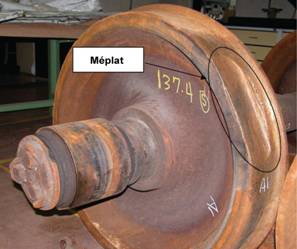 - On a remarqué des dépôts de métal fondu et solidifié le long de la table de roulement de la roue, alignés avec le plat.