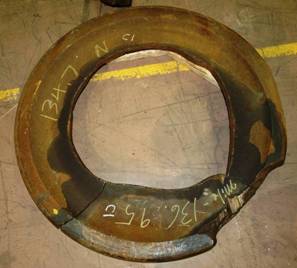 - Le morceau no 1 provenait de la jante de la roue et mesurait 22 pouces de longueur sur 10 pouces de largeur. Il montrait un plat de 4,5 pouces de longueur sur 3 pouces de largeur et 0,5 pouce de profondeur. Le rebord extérieur du plat se trouvait à environ 1 pouce du rebord extérieur de la roue. On a relevé des dépôts de métal fondu et solidifié le long de la table de roulement de la roue, alignés avec le plat.