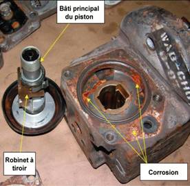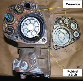 L'examen des roues, du frein à main, du régleur de semelle de frein et du robinet de retenue n'a pas révélé la présence de défauts préexistants qui auraient contribué à l'accident. Toutefois, les robinets de retenue n'ont pas passé avec succès tous les essais au banc. Il a été impossible de faire l'essai du dispositif de serrage gradué, parce que le robinet à tiroir était grippé. On a relevé de la corrosion localisée sur certaines des pièces internes des robinets de serrage gradué et de serrage d'urgence (voir la figure 3). On a remarqué que des pressions basses pouvaient rendre les robinets à tiroir davantage sujets au grippage. Le rapport précisait que les enquêteurs n'avaient trouvé aucun indice d'un problème chronique de freinage, que ce soit à la lecture du dossier de réparation ou au terme de l'examen de chacune des pièces de freinage (qui comptaient au moins 29 ans de service).
