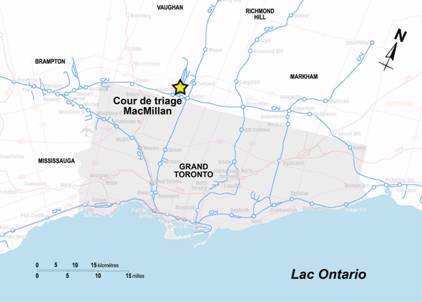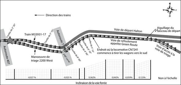 À environ 2 h 49 heure avancée de l'Est (HAE Note de bas de page 2) , le contremaître termine d'assembler une tranche de 97 wagons sur la voie C24. L'avant du train se trouve à 5840 pieds au sud sur la voie de refoulement (Green Route). La voie de départ Halton est parallèle à la Green Route, puis fusionne avec la Green Route au sud du viaduc de la route nº 7 (voir figure 2).